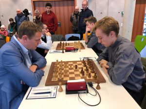 Die Partie von Jan Sprenger gegen Hou Yifan war spannend, da hat Jan mutig angesetzt (13. Sd5) und verwickeltes Spiel aufs Brett gebracht, dann aber mit 23. Lf5 fehlgegriffen, worauf die Chinesin nach dem Einschlag 23. … Lxb2 die Partie recht schnell zu ihren Gunsten entscheiden konnte.