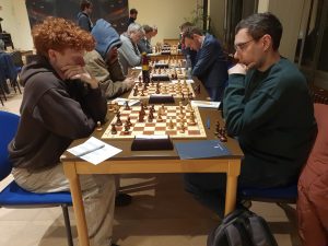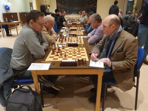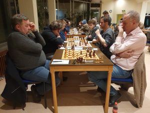 Am 7.1. hat die neue Ausgabe unserer Vereinsmeisterschaft mit 36 Teilnehmern begonnen. In der ersten Runde setzten sich ausschließlich die Favoriten durch. Besonders spannend war es an Brett 2. Udo Hoffmann rettete sich aus einer Verluststellung in das Endspiel Läufer plus Springer gegen den nackten König von Ievgenii Glushko, der bereits im Vorjahr als Außenseiter gegen Raphael Kracht einen halben Punkt erobern konnte. Zu später Stunde ist auch das nicht leicht, zweimal entwischte der Monarch, die Spannung stieg. Im Hinterzimmer wurde ein Bier auf den Sieg gegen Pizza bei Remis gewettet. Die 40-Züge-Marke war bereits überschritten als es Matt war. Daniel Weber hatte damit gleich zweimal gewonnen.