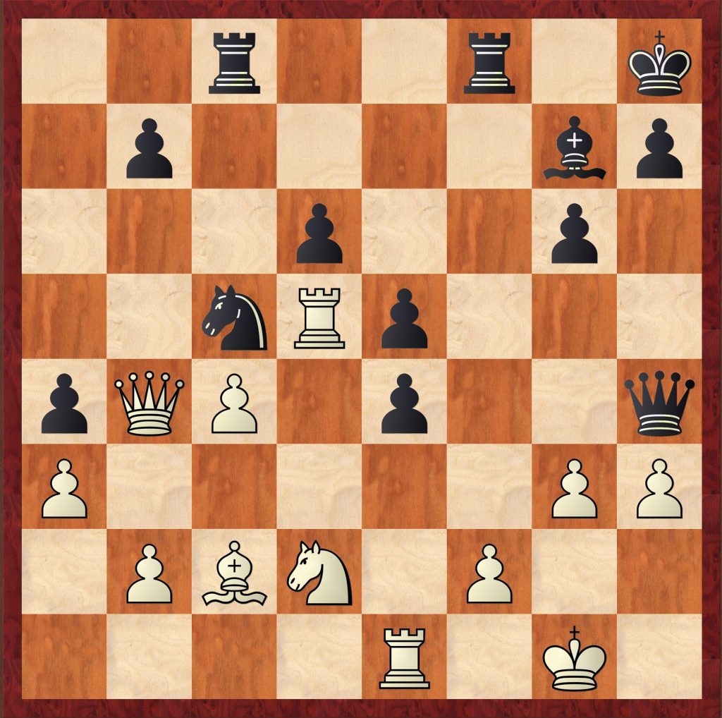 In der sechsten Runde gelang Daniel Weber ein recht glatter Sieg gegen Paul Noll. Bei Rainer Polzin und Thorben Lindhauer gab es einiges Hin und Her in der Zeitnotphase und einer unübersichtlichen Stellung. In folgenden Diagramm hatte Thorben mit Weiß gerade 1. g3 gespielt. Hiernach hat Schwarz mit der Partiefortsetzung 1. .. Df6 deutlichen Vorteil.