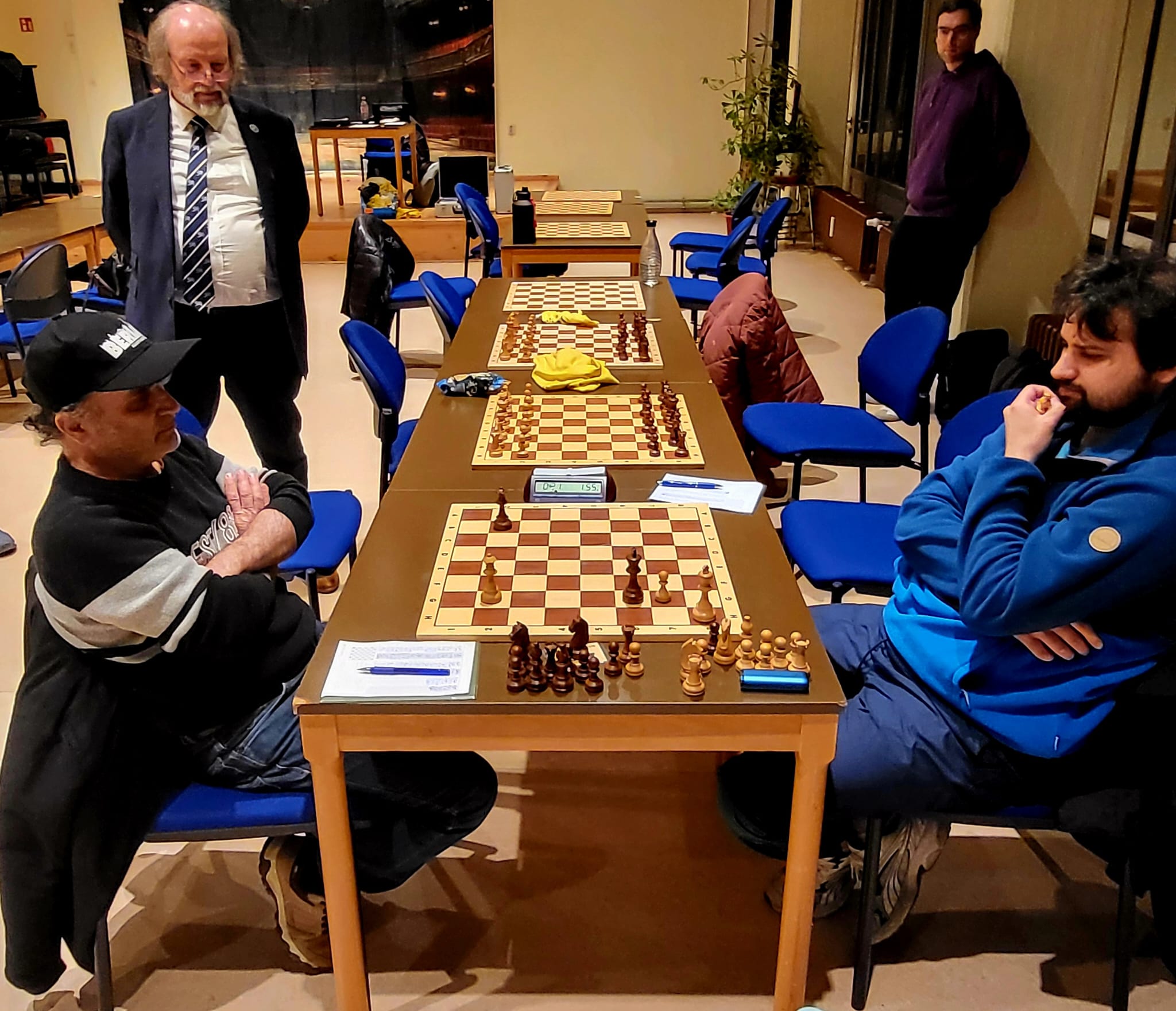 Am 7.1. hat die neue Ausgabe unserer Vereinsmeisterschaft mit 36 Teilnehmern begonnen. In der ersten Runde setzten sich ausschließlich die Favoriten durch. Besonders spannend war es an Brett 2. Udo Hoffmann rettete sich aus einer Verluststellung in das Endspiel Läufer plus Springer gegen den nackten König von Ievgenii Glushko, der bereits im Vorjahr als Außenseiter gegen Raphael Kracht einen halben Punkt erobern konnte. Zu später Stunde ist auch das nicht leicht, zweimal entwischte der Monarch, die Spannung stieg. Im Hinterzimmer wurde ein Bier auf den Sieg gegen Pizza bei Remis gewettet. Die 40-Züge-Marke war bereits überschritten als es Matt war. Daniel Weber hatte damit gleich zweimal gewonnen.